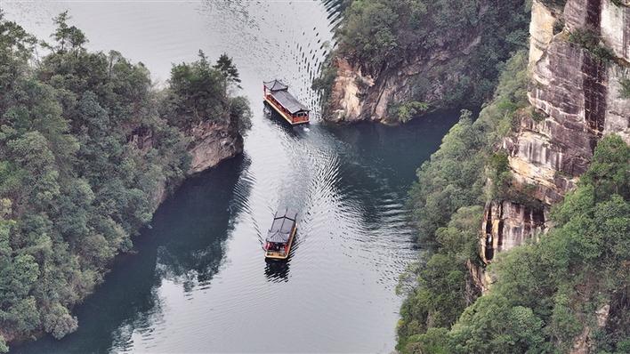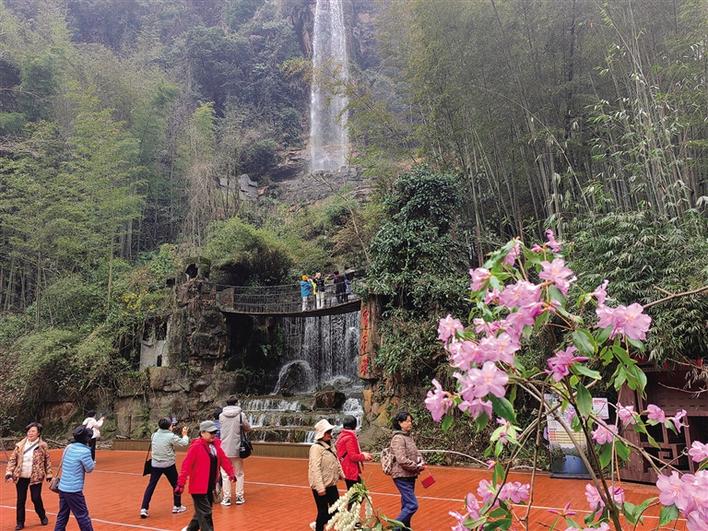 荡舟“人间瑶池”宝峰湖,游客或驻足拍照,或凭栏远眺,或聆听鸟鸣,沉醉在“人在画中游”的诗意景致里。行走在山水舞台,清澈的瀑布从岩壁间倾泻而下,如烟似雾的水流与两岸葱郁的竹林、初绽的粉色杜鹃相映成趣。悬于瀑布之上的吊桥,作为《西游记》《阿凡达》等影视剧的取景地,也成为游客打卡的热门点位。